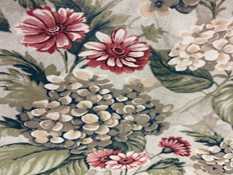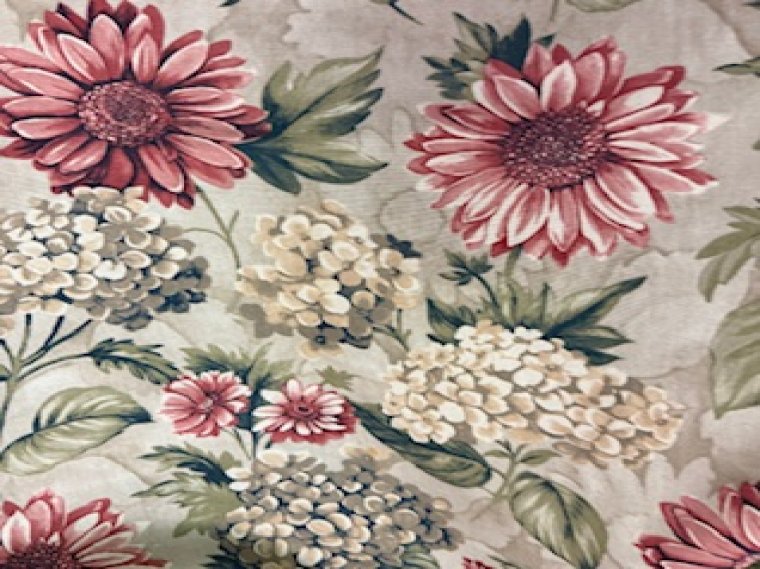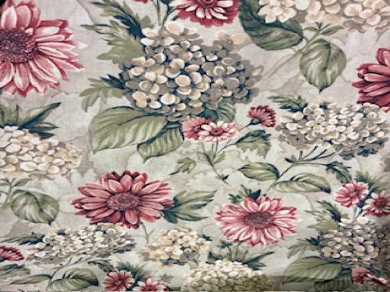This is a gorgeous, heavy woven cotton floral with red daisy's and hydrangea's featuring greens, ivory and beige tones too.
