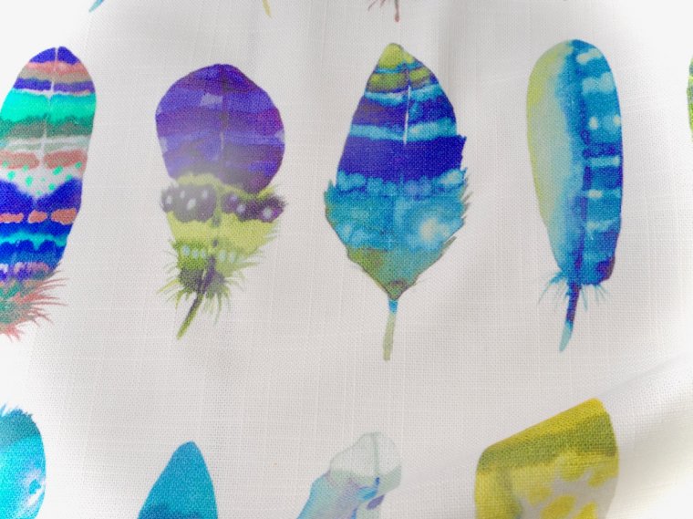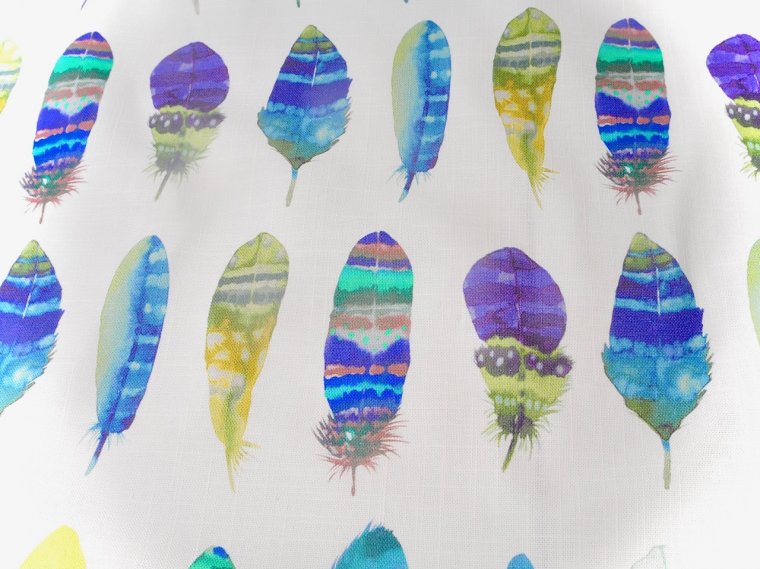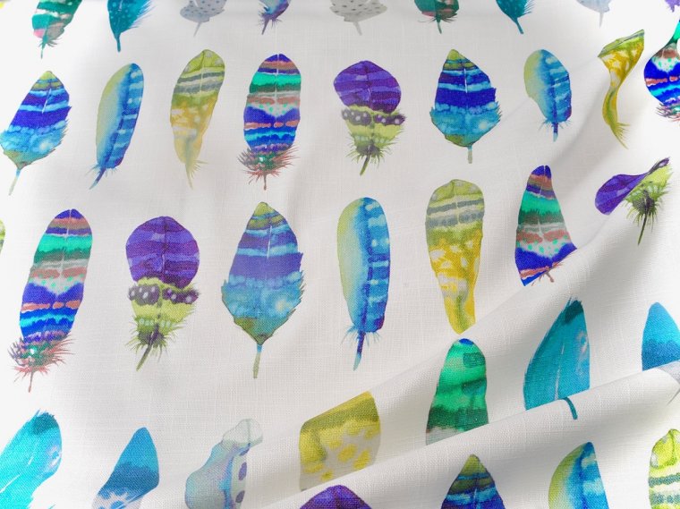 This is a beautiful hand painted watercolor look fabric in vivid colors of feathers in stunning shades and designs. Perfect for upholstery fabric, drapery fabric, bedding, this is discount fabric that looks like it is worth a fortune. Fabric is a very durable blend of linen and cotton, which is washable. There are four different colorways for this fabric and we have them all. This fabric is tightly woven, conferring great strength and durability to the fabric. It is ideal for a sofa which will see a lot of use....it will still look great after many years, a chair and ottoman, drapery, bedding and so much more.