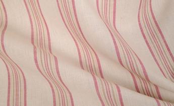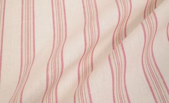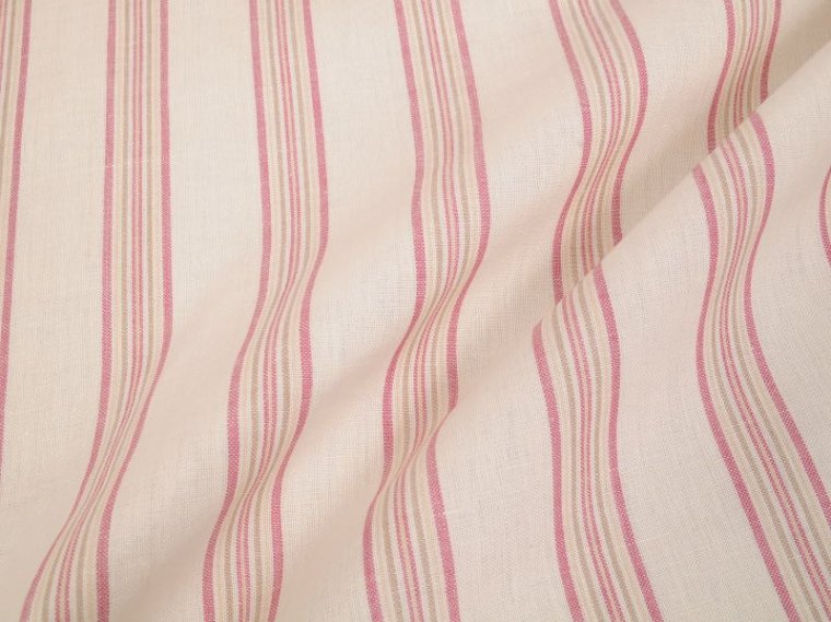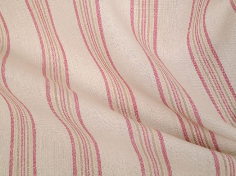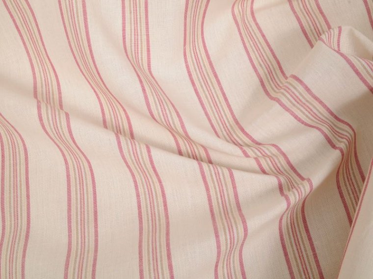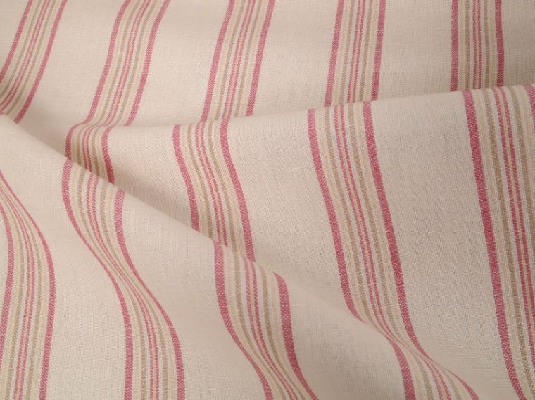 This is a wonderful cotton & linen stripe fabric. It comes in an ivory color with pink and grey / beige stripes. It is already backed for upholstery, great for drapes, slipcovers, bedding and much more.