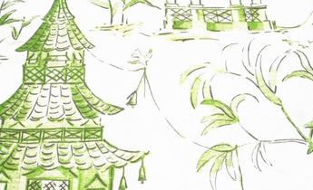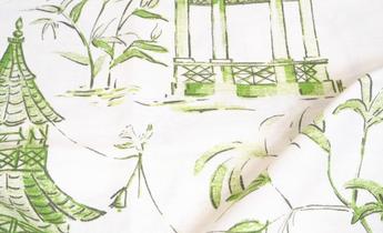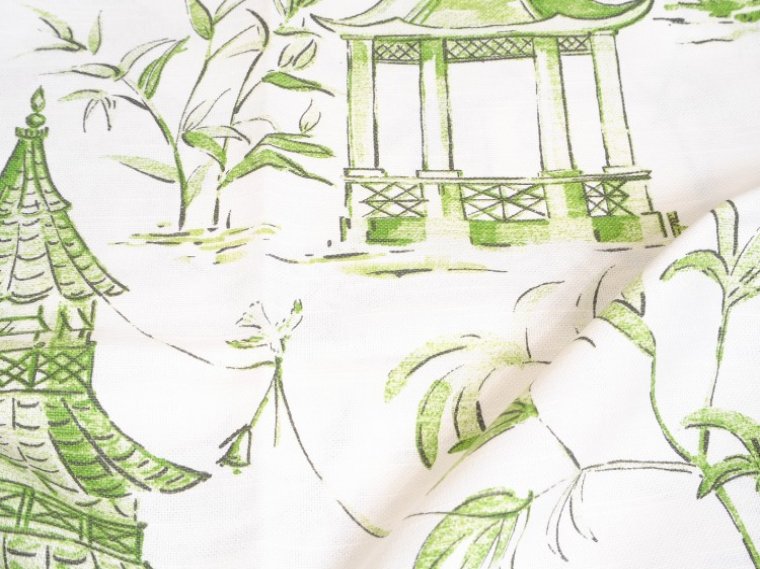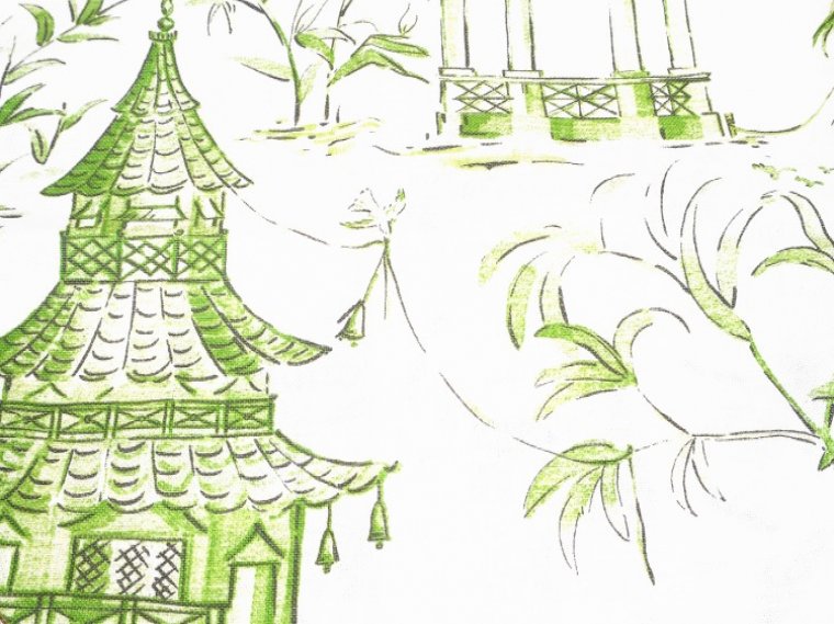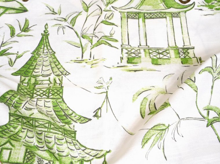 Jade Green Oriental Pagodas on100% Cotton Fabric, Ideal for Any Decorating Project, Washable, Very Durable
