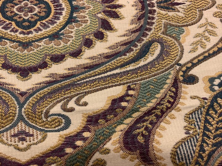 This is an outstandingly beautiful woven tapestry fabric with paisley influences. This fabric is incredibly strong yet soft on the hand, and is ideally used to upholster a sofa or chair or slipcover a sofa, bedding, drapery etc. It has a wide variety of applications, especially those applications which require a beautiful fabric with softness and strength. This is your opportunity to purchase a high end fabric at a small fraction of the designer per yard price and do your furniture in a superior fabric at an overwhelmingly discounted price. PLEASE NOTE: THIS FABRIC MUST BE PURCHASED AT A MINIMUM OF 5 YARDS PER ORDER, AND DELIVERS IN APPROXIMATELY 3 WEEKS.